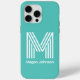 This modern monogram aqua iphone 15 pro max case is trendy yet and classic. It features your first or last initial in a bold trendy font and your name in a coordinating classic font in white. It's simple and minimal, chic and bold.
