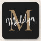 Modern Monogram Black Gold Feminine Script Name Beverage Coaster. Easily personalise this modern elegant beverage coaster with your custom monogram and name.