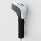A golfer's golf head cover, featuring a modern monogram with a teal initial and a pretty black trendy script signature last name.