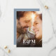 Modern dusty blue wedding save the date announcement featuring your photo overlayed with your monogram initials showcased in large elegant white typography. Personalise your save the date details on the back in simple white lettering.