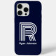 This modern monogram navy blue iphone 15 pro max case is trendy yet and classic. It features your first or last initial in a bold trendy font and your name in a coordinating classic font in white. It's simple and minimal.