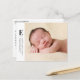 Easily share your exciting news with this photo birth announcement postcard. On the front of the card, a large square photo is displayed. To the left of the photo, you can add your newborn's first initial, full name, and birth stats. The back of the postcard includes space to write a personal message to recipients.