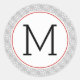 Modern monogram snowflake pattern Christmas holiday sticker. This holiday sticker features your monogram in black in a white round frame with red outline. There is a pattern of white snowfakes on grey around it.