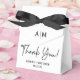 This Modern Monogram Wedding Thank You favour box with the bride and grooms initials, Thank You in a trendy script font and the happy couple's names and wedding date all in black tied with an elegant black satin bow would be perfect for favours at your wedding reception. It would be great for a candy station, on a thank you gift table, or at each place setting with a favour. Be sure you order enough for all your guests.