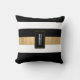 Modern black, white and gold tone accent throw pillow with a bold horizontal striped pattern. A black and gold tone decorative plaque, has a custom white one letter monogram. Personalise the letter to suit your needs. Matching home decor is available.