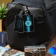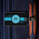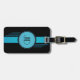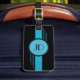 Art Deco Luggage Tag. Initials are framed in a blue circle with black double border and blue stripes