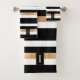 Modern black, white and gold tone bath towel set with a bold horizontal striped pattern. A black and gold tone decorative plaque, has a custom white one letter monogram. Personalise the letter to suit your needs. Matching bath decor is available.