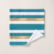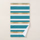 Modern teal, white and gold tone bath towel set with a bold horizontal striped pattern. A teal and gold tone decorative plaque, has a custom white one letter monogram. Personalise the letter to suit your needs. Matching bath decor is available.
