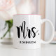 This beautiful Mrs mug features bold brush calligraphy with a custom last name in clean uppercase lettering beneath, all on a crisp white background with a lovely pink interior accent. The oversized script paired with the soft pink creates a romantic, modern aesthetic perfect for the new Mrs. The last name is fully editable. A stunning gift for the bride, newlywed, bridal shower, or anniversary. Pair with the matching Mr design for a coordinating set.