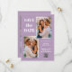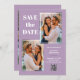 These modern and stylish lavender wedding save the date cards feature three photos of the couple, plus bold, white text on a light purple background. Add your QR code for your wedding website or for guests to rsvp online.