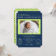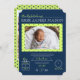 Custom Design includes a blue background, green frame, green back with blue polka dots, calendar, clock, scale, and ruler birth stats. The back features 3 family photos.
