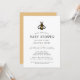 Modern line art bee in black and orange with green heart in the middle baby shower invitation. Modern typography used. On the back of the card is dust yellow with ghost honeycomb pattern.