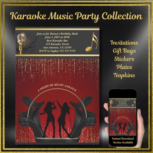 Celebrate your next event with a night of music and fun! This stylish invitation features a modern sleek red, black, and gold design with a touch of musical flair, perfect for a chic and contemporary celebration. Customise your event details and invite your guests to a night of stylish singing and celebration.