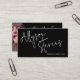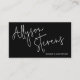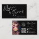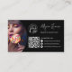 A modern and bold simple makeup artist and hair stylist business card featuring oversized name at the front in a handwritten style font and photo, qr code and social media at the back on black. All the colours are editable.
