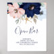 This modern nautical floral open bar sign is perfect for a cruise or beach wedding. The whimsical design features blush pink and navy blue watercolor flowers with gold starfish accents, giving it a beachy vibe.