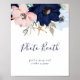 This modern nautical floral wedding photo booth sign is perfect for a cruise or beach wedding or bridal shower. The whimsical design features blush pink and navy blue watercolor flowers with gold starfish accents, giving it a beachy vibe. The sign says "photo booth grab a prop and strike a pose". This sign can be used for a wedding or any event or party.