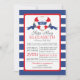 Modern red, white & blue nautical baby shower invitation for a baby boy shower. Our Ships Ahoy contemporary boy baby shower invitation features a red & white stripe heart Buoy with a blue banner with the word boy on it. The background is a bold & bright blue and white horizontal stripe. Flip the invitation over for a matching stripe back. Visit our shop to view this for a girls baby shower and a gender neutral baby shower.