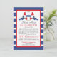 Modern red, white & blue nautical baby shower invitation for a gender neutral shower. Our Ships Ahoy contemporary boy or girl baby shower invitation features a red & white stripe heart Buoy with a blue banner with the word baby on it. The background is a bold & bright blue and white horizontal stripe. Flip the invitation over for a matching stripe back. Visit our shop to view this for a girls baby shower and a boys baby shower.
