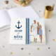 Custom wedding guest book features a nautical theme with navy blue boat anchor, stripes pattern, custom text and photo that can be personalised.