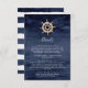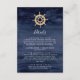 This modern nautical ship helm wedding details enclosure card is perfect for a cruise or beach wedding. The simple design features a gold boat wheel on a navy blue watercolor background.