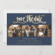 Elegant navy blue and gold wedding 4 photo save the date cards with modern calligraphy. Easily personalise this card with your images and wedding details including a wedding website.