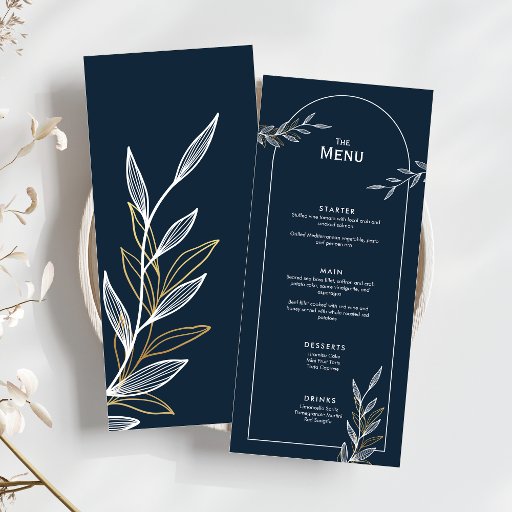 If you are a modern bride seeking an elegant and timeless invitation, this design is just right for you. Featuring a beautiful combination of navy blue and thoughtfully arranged gold leaf, it boasts a contemporary style that compliments any colour palette.
