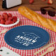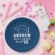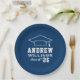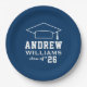 Custom round graduation paper plates features a navy blue and white design (can be modified via "Customise It!") with a graduation cap and custom text for the grad's name and class year.