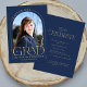 This navy blue and gold simple minimalist graduation card serves as both a graduation announcement and grad party invitation, and features a photo, arch frame and elegant modern typography.