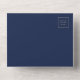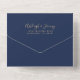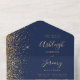 The left-hand edge of this elegant modern all-in-one wedding invitation and RSVP features a gold faux glitter border. The customisable text combines gold-coloured whimsical handwriting, copperplate and italic fonts on a navy blue background. The return address appears on the outside flap and the reverse side of the detachable RSVP card in gold-coloured text on solid navy blue. A QR code is included on the RSVP card for guests who would prefer to reply online.