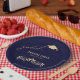 Elevate your graduation celebration with these stylish navy blue paper plates featuring a gold grad cap symbol, the word graduate in gold script, your name and class year, and a delicate gold floral design.
