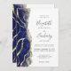 The left-hand edge of this elegant modern wedding invitation features a navy blue alcohol ink border trimmed with faux gold foil and faux glitter. The customisable text combines handwriting, copperplate and italic fonts in charcoal grey on a white background. The reverse side features a matching navy blue and gold design.