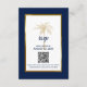 Provide your guests to reply to your wedding invitation and explore your wedding website with this elegant RSVP details and QR code design featuring modern script, navy blue and gold including an artistic palm tree and metallic gold frame on the front of the card. A navy blue background is on the front and back.