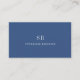 Simple, trendy business card design in modern typography. Front of card features monogram and name in elegant script font on navy blue background. Back of card features business contact details on a clean white background. The name, title and contact details can be easily personalised for a professional design statement to promote your business. Get yours today!