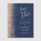 The left-hand edge of this elegant modern wedding save the date magnetic card features a peach faux glitter border. The customisable text combines peach handwriting, copperplate and italic fonts on a navy blue background.