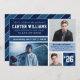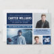 Modern style graduation announcement card and party invitations feature a collage of three (3) photos of the graduate in a modern colour block collage with stripes design. Navy blue, sapphire, powder blue, cloud blue, and white colours.