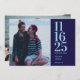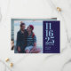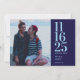 These sleek and contemporary photo save-the-date cards showcase a sophisticated navy and light blue palette with a bold yet refined typeface. The design highlights a couple's photo prominently on both the front and back. Prefer a more streamlined look? Replace the back photo with a solid navy background for a chic minimalist finish.