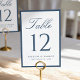 This navy table number card brings a classic look to your reception tables with a navy border that frames the design in a timeless way. “Table” is displayed in elegant calligraphy at the top, with a large serif table number centered below for easy readability. The couple’s names and wedding date are displayed beneath, adding a personalized touch that pairs beautifully with formal, traditional, and coastal-inspired weddings. This card measures 3.5"x5". Edit each table number individually and add them to your cart to ensure a smooth ordering process.