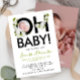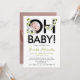 This modern announcement features a striking bold black script with the words "OH baby" set against a crisp white background, beautifully accented with delicate floral ornaments in soft white and green hues. The reverse side offers a personal touch, allowing you to customise it with your baby's photo and name, making each announcement uniquely yours.