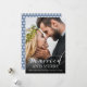 Christmas modern married and merry full wedding photo card. On the back of the card is a dusty blue with a light grey polka dot pattern.