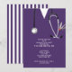 Creative nursing school graduation invites featuring purple hospital scrubs and healthcare supplies.