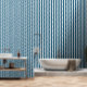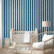 This modern ocean blue and white striped wallpaper adds distiction to any room.
