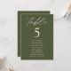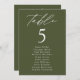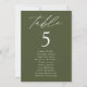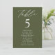Elegant wedding seating chart featuring "table" displayed in white calligraphy script with the table number and guest names shown below on an olive green background. The design repeats on the back. To order the table number seating chart, edit each card with the table number and guest names and add it to your cart. Designed to coordinate with our Modern Elegance wedding collection.