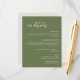 A modern and elegant olive green wedding details card, featuring customisable reception, accommodation, rsvp and wedding website details.