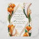 This stunning, stylish yet traditional wedding invitation is created with real gold foil and has vivid orange and soft ivory calla lily florals on an elaborate golden geometric frame. Customise the template to suit your needs for any event.
