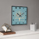 A square clock with a muted green background layered over top is a light yellow tree with 2 orange bird silhouettes sitting on the branches.