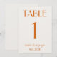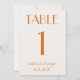 Modern and elegant whimsical orange and cream wedding table numbers. As you see it features a cream background with bold orange script that matched the whole suite.
