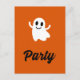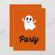 Fun Halloween party invitation shows a smiling, cute white ghost and the word "Party" over a Halloween orange background. Customise and personalise the details on the back.