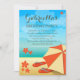 A modern design for a tropical beach party or luau party for a birthday celebration. This design features an orange and cream beach umbrella on a tropical beach with flip flops and bright orange-red flowers with the beautiful blue ocean in the background. The text is fully customisable for your own special occasion.