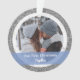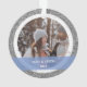 Splashy yet elegant Our First Christmas Together personalised photo Xmas ornament for recent couples, with modern cursive typography / hand lettering on a stylish semitransparent blue band, a frame of white and silver snowflakes and little stars, and another frame of simulated silver glitter. Make sure you personalise at least the two photos (front and back), and the first names and the year on the back.
