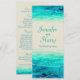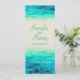 Beautiful blue green painted sea with graphic waves sparkle overlay wedding menu. A beautiful beach, coastal ocean inspired, contemporary, wedding invitation featuring a unique stylised, hand watercolor sea, on a sand colour paper. Perfect for a modern beach wedding. Edit this invitation with your own words. Unique designed and painted by Sarah Trett.